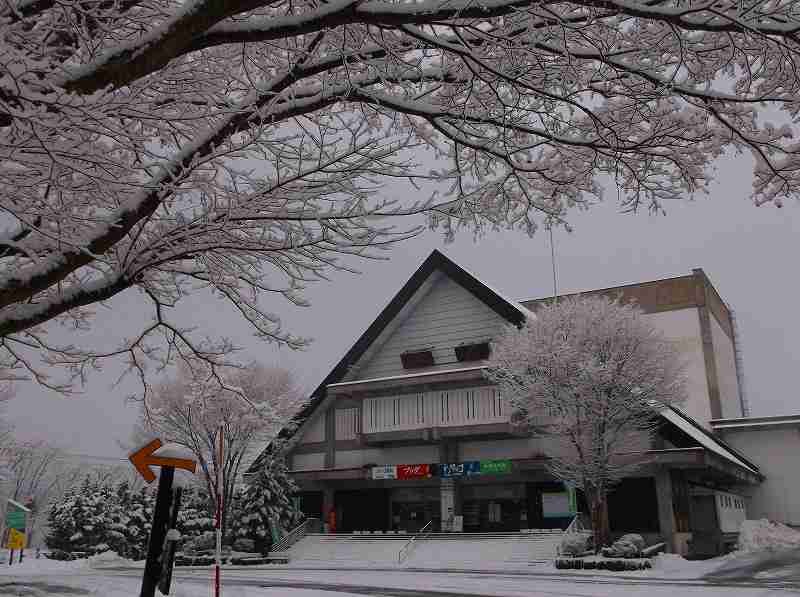 ” わらび劇場”を望む木々、朝”樹氷”の様!マキティーナイビランドー!沖縄の様子が何故秋田に全く来ないのか?わらび劇場を見つめる。おやじさん(原太郎)を思う。御客様の心が集まって出来た”わらび劇場”。庭の真弓ドライ。