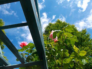 田沢湖ビールレストラン前。大道具スタッフ制作”薔薇アーチ”!ガーディのオシャレなデザインで今年更に薔薇の品種が加わる。一人より二人、二人より三人!皆の力で全てのゲストにウエルカム。わらび座”Always Bule Sky”!
