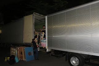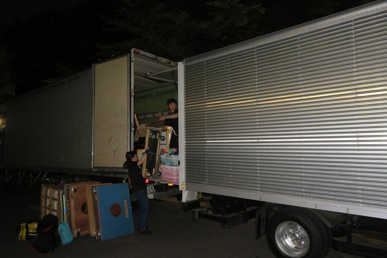 大型トラックが搬入口まで行けないため(通路トンネルの天井高さのため)会場の2tトラックにセット類を移してのピストン搬入も!!