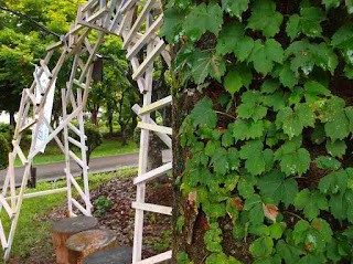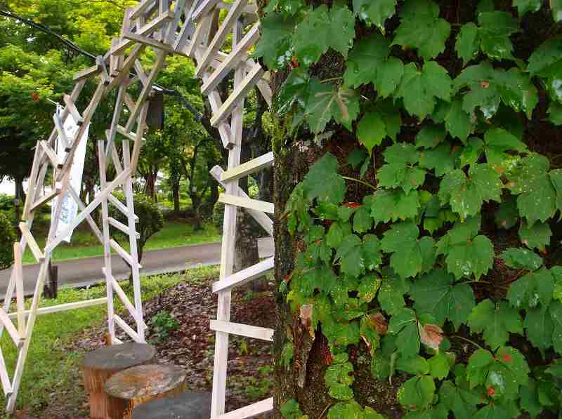 大道具スタッフアレンジのアーチと風鈴。時を経て大きな幹肌に”個性”が見えて来た木々。欅(けやき)に彩る夏蔦!ブドウ科、紅葉蔦。夏のグリーンと秋の紅葉。 猛暑を越え、庭に”秋の風景”を創造する。