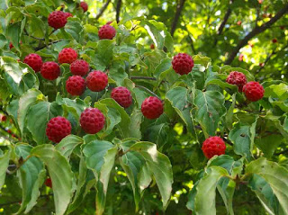 東屋庭!ビール醸造の香り。木の上には山法師(やまぼうし)の実!トロ~ッとして甘い。春の寒さ、夏の急上昇高温。稲は秋の光にじっくり頭を垂れ始めた。”シウリザクラ”南限絶滅危惧種を訪ねられた御客様。