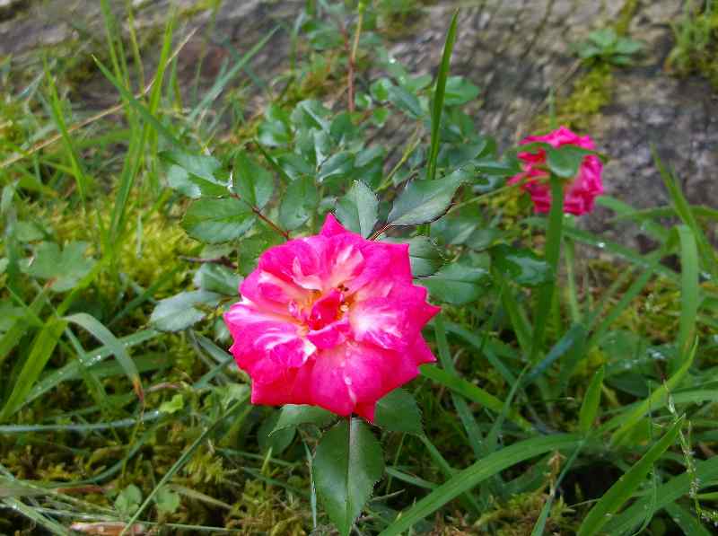 ビールレストラン前。一年前秋に挿した”ドリフトローズ”。20本中1本の活着。二度目の花!”良く見て試し考える”石川リキノスケ。繰り返し試すんだ。”永久の未完成、これ完成”宮澤賢治。