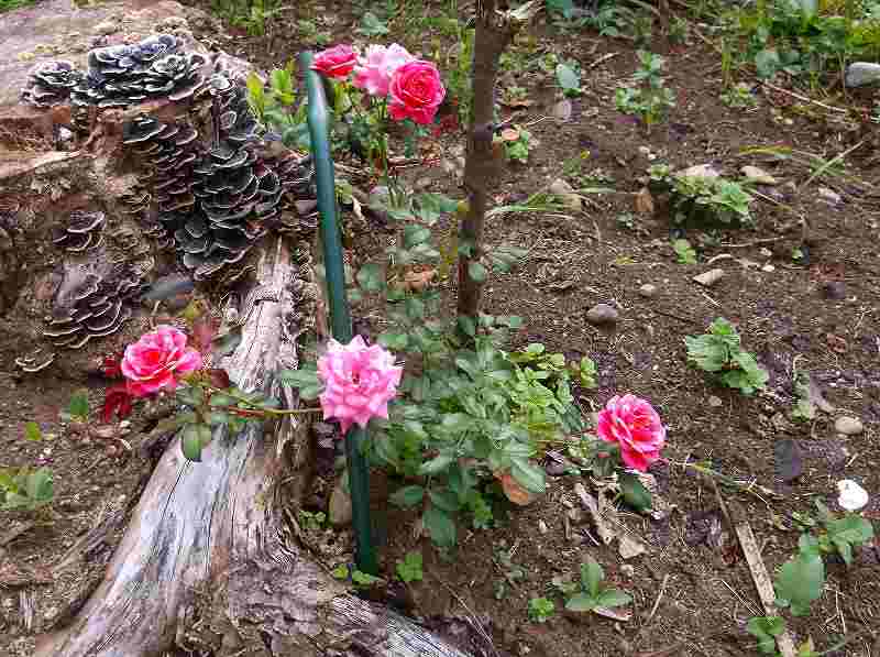 田沢湖ビールレストラン庭!カツラ切り株の丘に挿し木で育てた”ドリフトローズ”。二度目の開花!花数も増えて来た。這い性の薔薇。丘を下って一面に咲く日を想像する。花や芝地に遊ぶ野鳥、虫。