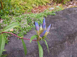 ホテル縮小庭園石組みに、そっと覗く”深山竜胆(みやまりんどう)”。秋は透明色。大きな山々の紅葉も来月。寒暖差が織り成すマジック。”霧”に染められる木々の葉。必要な物が揃うと奇跡の様な美が生まれる。