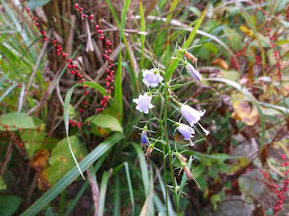 庭の遊歩道”秋の草花”。ツリガネニンジン。秋の光に揺れてビードロの様。真っ赤な水引!ススキの根元、木の根沿いに”あっキノコ”! 山は乾燥でキノコが育たないと言う。