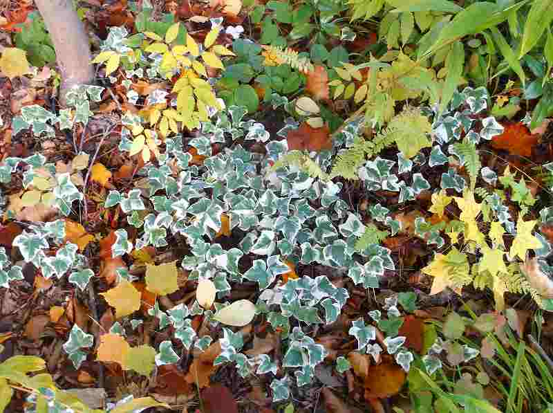 ホテル前縮小庭園!近隣の山々を切り取ってデザインされた庭、上は紅葉、下草も落葉した葉に囲まれ明るいアイビーが走る。歩いて見なければ気付かない事。次々芽生える命。太陽や雨、風。大地は優しさで一杯!