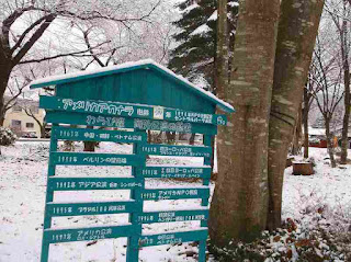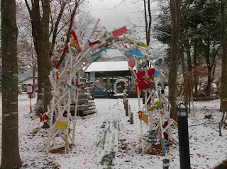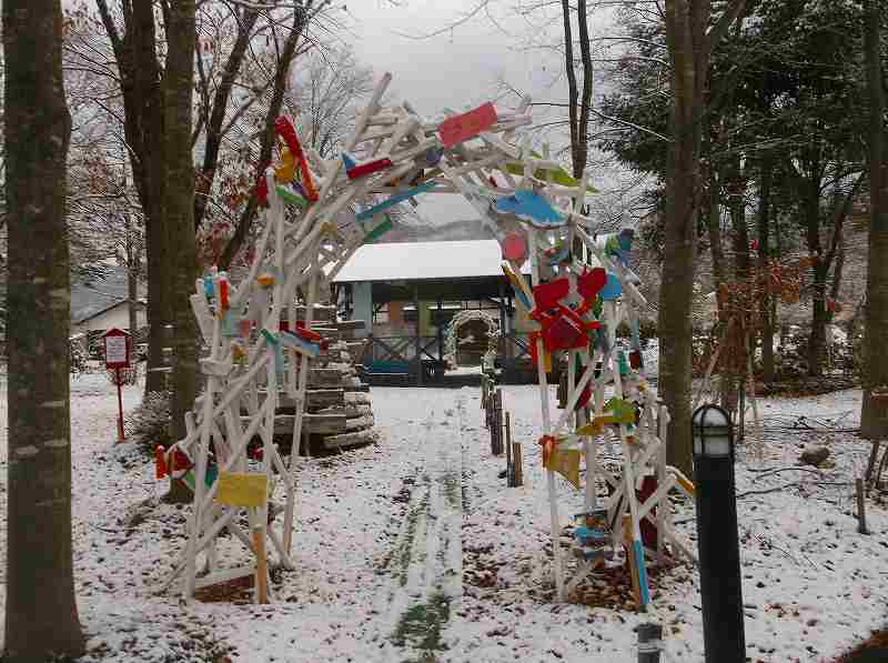 イルミネーションを設置していた大道具親方が、移植準備していると、”この辺りが良いよ”と声をかけてくれる。デザイナーがいる!芸術村。職人の居る芸術村。雪のアーチから、東屋を抜け更にアーチを潜ると秋田犬!