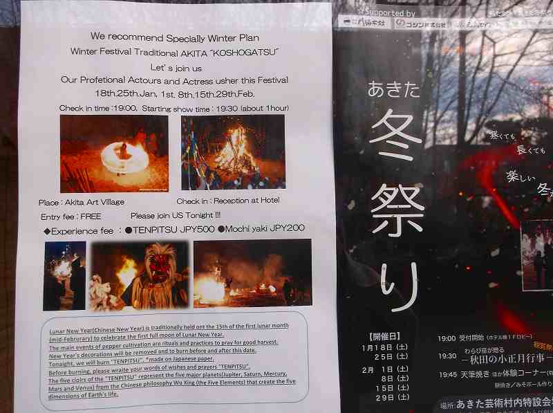 あきたび玄関前!明日は最後の冬祭り!(火祭り)。英語の御案内をスタッフが創れる!雪の無い大地からグッと力強い水仙の蕾。ボタン雪、粉雪。突風をついて飛ぶ野鳥。気流を読む野生の力。Take off!離陸。そして着地。