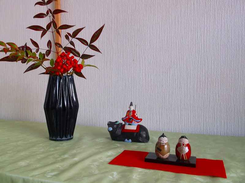 総務玄関先、季節の生け花が絶えない。庭の南天赤紫の葉と花瓶の色。雛飾り、小さな玩具。(春ちゃん)が大切に集めた足跡。 (小さな体でも腕を思い切り伸ばして!大きく踊るのよ!)明るい先輩の思い出。