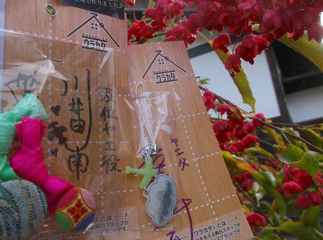 東屋庭。秋のクヌギ!空!上演中グッズから(航平君と野衣さんの衣装ハギレで創られた飾り)。”空が似合う野衣さんには。夢が似合う野衣さんには。そして今僕も見つけた、君を助けたい、力になりたい僕の夢!”