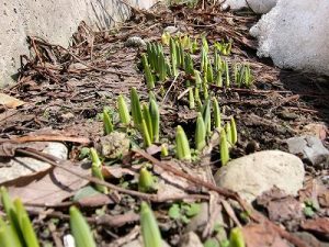 ぽかぽか暖かい日和。もう直ぐ(啓蟄)地下に眠った命も目覚める。樹木が起きて皆を促す。積もった雪の隙間には、水仙の芽!3月10日辺りの最後のドカ雪を経て一気に春へ。