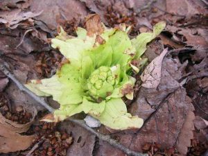 雪の圧で潰れた落ち葉。落葉を押しのけ顔を出す蕗の薹(ばっきゃ)。芸術村が出来てから生まれた施設の名前(ゆぽぽ、アイヌの歌と秋田の温泉)、和食処ばっきゃ(地元の人たち待ち続ける春)