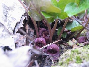 ホテル前縮小庭園!気温は15℃超す。チューリップの季節。山野草”薄葉さいしん”漢方薬。薄い葉の下に小さな花。別名(馬の鈴草)。山と共に人間の暮らし。野の花。土石木。