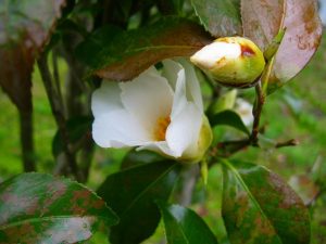 ホテル厨房食材園。椿”侘び助、わびすけ”。和食会席に使われる椿の葉。お正月の南天。初春から順に咲く。やぶ椿の赤。寒椿、山茶花、白の侘び助。防風林,防砂林、古人の知恵。