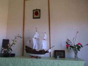総務玄関口。長崎諫早から”ジパング青春記”に作って下さった御客様の作品。芸術村庭から集まる花々。空へ昇った友を忘れない。旅一座の花。出航への手向け花。