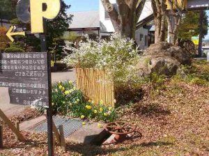 ゆぽぽ玄関口に咲く”雪柳(ゆきやなぎ)”。石組みと竹垣、側に立つ、わらび座大道具さんによるたて看板。下にはこの地域を繋ぎ潤す用水路の水門分岐点。レトロと和の融合。