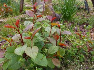 小劇場庭。ヒロシマ被爆樹の種が親木に。足元に芽生える高山に育つ”シウリザクラ”。関東圏で絶滅に瀕する樹種。親木から4mほどの距離にもヒコバエを出す。
