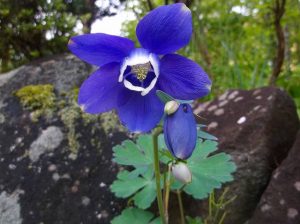 カラカラ回る糸車。”深山苧環みやまおだまき”。ホテル縮小庭園山野草。風が運び、虫が運び、鳥が運ぶ。水溜りで水浴びする雀。アイヌのユカラと雀。神の国と人を結ぶ鳥。