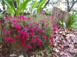 数年前、農家倉庫から頂いた”木臼”。庭の大きな植木鉢。芝桜やイヌサフランを植えた。流れ落ちる芝桜。雨雪に朽ち、最後は大地に戻る。花も木も1つの命”母なる大地”。