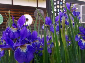 アヤメ!二十四節気”芒種”。青地に(虎斑文様)。カキツバタは白筋文様。似ていて皆違う。大道具さんが劇場スロープを作る、水車を作る、舞台を造る。人が宝!全ての人が宝。