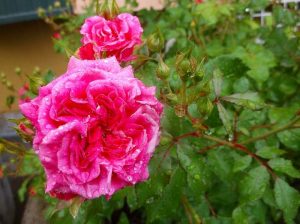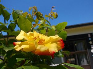 今年の敷地内一番手”薔薇”は小劇場(旧記念館)庭”お千代さんの薔薇”。口伝と樹木、花、建物。大雨から一転青空!世界大地との交信。立ち上る霧。何度も何度も!