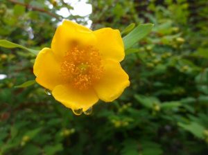 小劇場(旧記念館)玄関前花壇”金糸梅(きんしばい)”。中国原産。晴れ渡り鳥海山が見える。駒ケ岳と二つの御山に守られた土地。花、樹木の”故郷”。世界は繋がっている。空!