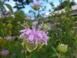 小劇場(旧記念館)庭。”ヒロシマ被爆樹、青桐あおぎり”足元に咲くベルガモット!松明花(たいまつばな)ハーブ。水、火、命。人間の良心。
