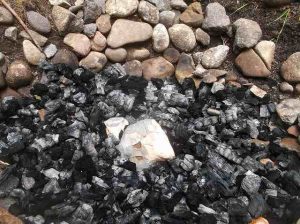 里山プロジェクト。大人が掘り、子供たちが石を組む。薪がパチパチ燃える。炭が出来る。飲み水も作れる”炭”。人間が生きる力、知恵。未来へ!