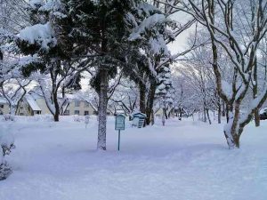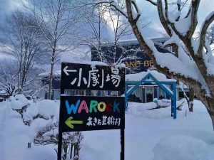 どっしり積もった雪の庭。修学旅行記念樹とアメリカNPO視察で戻ったセントラルパークのドングリ。神代の雪にビックリしながら”樹”に育った!看板にはわらび座海外公演の歴史。戦後日本初!のアジア公演から始まった。