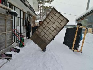 わらび座大道具制作場。歴史は古い。ここから皆生まれる。なかいちホール”イザベラバード”稽古開始!何処の場面かな?秋田の民家かな?七草を過ぎ、雪はこれから。大分に向かった武四郎!東北の心!皆の絆。1つずつ紡ぐ。