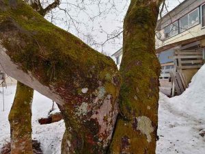 ポプラ寮庭。ヤマモミジ。二本が重なり一本に育つ。元在った社宅を改築した35年前。初期の社宅は50年。おやじさん(原太郎)が作曲していた”わらび寮”は小道具倉庫として、民舞、作品の原型を保存。大切な原点!