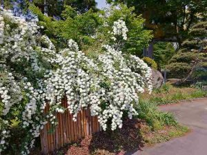 コデマリ(小手毬)咲く前に手造り竹垣設置。小道具さんの”リサイクル”竹。バラ科シモツケ属。中国原産。花言葉は(友情)江戸期。二十四節季”小満”田んぼに水が入り(田かき)始まる!