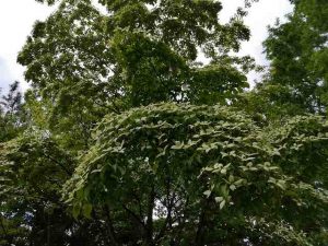 工芸館庭。ヤマボウシ(山法師)ミズキ科ミズキ属。落葉高木。明治、東京の市長がアメリカに友好の証に桜を。御礼に贈られたのがアメリカヤマボウシ(ハナミズキ)花言葉は”友情”。夏の始まり!