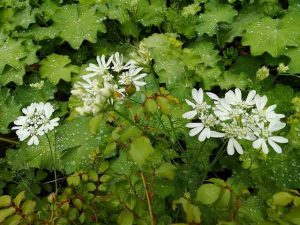 ホワイトレース!研究所(旧化石館)前花壇。ヨーローッパ自生。せり科一年草。花言葉は(細やかな愛情)傍に”ドリフトローズ”挿し木とレディースマントル(聖母マリアのマント)里山にも御裾分け!