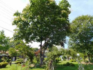 小劇場(旧記念館)庭。アオギリ(アオイ科アオギリ属)沖縄、台湾、中国、ベトナム原産。奈良時代に渡来。花言葉”秘めた意志”。わらび座合奏団と広島被爆樹種。足元にアンネの薔薇、カズエの薔薇。