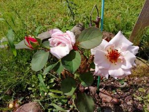 小劇場(旧記念館)庭。カズエの薔薇。ユー君ヤックン、カズエさん。45年前。日本の横浜住宅街にアメリカの米軍基地からファントムが落ちた。小出美苗作詞作曲”ファントムよりも鳩を”6日の蝉。