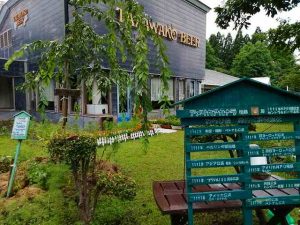 田沢湖ビール瑠璃ホールが”わらび座の会、サロン”会場の入り口。八重紅枝垂れ(タイ国クリスチャンカレッジ修学旅行記念樹)それぞれの人生、節目。わらび座が灯して来た心の明かり。