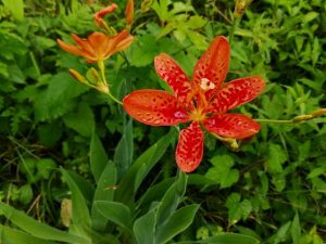 ヒオウギ(アヤメ科アヤメ属多年草)不意な土砂降り。特別公演に向け、稽古や準備が進む。熱中症を潜り抜け作業を進める。小さな花にホッ一息。”皆ここから生まれるぞ”わらび座”金次郎” 土!