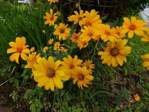 小劇場(旧記念館)入口。菊芋もどき(キク科、北アメリカ原産)花言葉”憧れ”。植えたものではない花があちこちに咲く。風媒花、虫媒花。色んな力が命を生み出す媒介。土は命の宝箱!