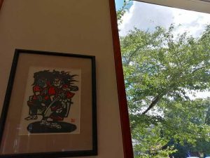 71周年!コロナを超え,皆の力が集まる。世界中コロナが流動。祭り三年ぶりの復活。心休まる故郷。密を避け一人一人が身を守る。わらび座の会サロン、壁にこっちゃん(下野さん)の鬼剣舞!