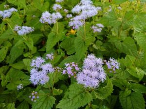 社宅に咲くアゲラタム(カッコウアザミ)木陰に美しい紫!里山プロジェクトエリアにも秋の紫”花の道”が現れる。草を取り、草を刈れば皆の足跡が現れる。繋げ繋げ!負けるな負けるな!新しい世界へ!
