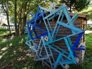 東屋中央広場。コロナが始まって全てがストップした時生まれたミニログハウス。里山に描いたビオトープ水車!わらび座大道具さんの仕事!黙々と言葉は少ない。確実に美しく入れ替えるチェンジの見事さ”職人”