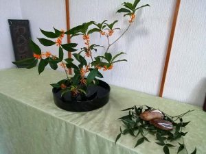 金木犀とアケビのアレンジ。総務横に植えられたキンモクセイ。夜になる程香る。モクセイ科モクセイ属。日本三大芳香木。秋の花。雌雄異株。花言葉(謙虚)。中国では酒やお茶に。夫々の文化。