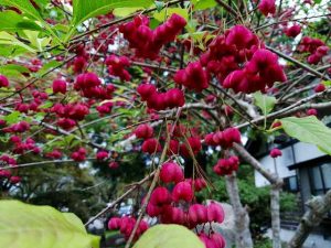 温泉ゆぽぽ、お食事処ばっきゃ前、糸杉の坪庭。真弓(マユミ)ニシキギ科ニシキギ属。日本と中国原産。昔この枝から弓を作った。ピンクの殻が割れると中から赤い実がぶら下がる。稲刈り進む秋田。