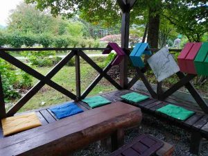 二十四節季(寒露)鳥海山に初冠雪!気温がグッと下がる。東屋を天気を見て拭き掃除。そしてカラフル座布団を敷く。アイデアをくれたスタッフに感謝!人材は宝!宝を繋ぐ。負けるな負けるな。