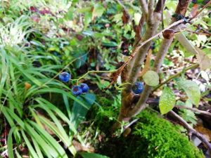ホテル前縮小庭園。中心木(メイントゥリー)イイギリの根が苔むす。横に走る根にサワフタギの実生が初!実り。8年の時。一本の木が初めて実を付けるまでに、その”樹木の時間”、特性がある。