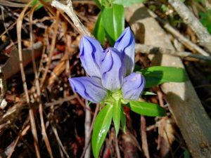 ホテル前縮小庭園。深山リンドウ。ゆっくりと次々蕾を膨らませ雨に光る!お菓子の様でも在り美しい!剪定した枝は木の周りで土に戻る。人間が知らない生命が土の下に無数に在る。