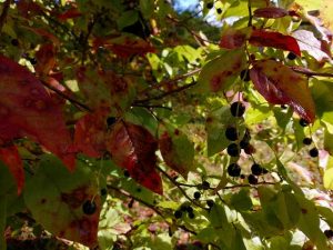 研究所前庭ナツハゼ!実りと紅葉が始まる。稲刈りの季節に山からアキアカネが下りてくる。雨上がりの水たまりに産卵をする(くっつきトンボ)未来へ命を残す為に生きている。一年の命!