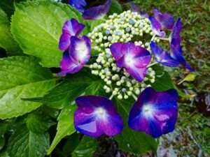 ガクアジサイ紫!雨。あちこちで地球の災害。人間と地球。どうすれば共生出来るか?先達は河と山といつも綿密に話し合う。(そこがどんな土地なのか?そこにどんな風が吹くのか?)