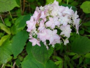 ピンクのアナベル(西洋アジサイ)雨が降らない庭。スプリンクラーも”1つ”を少しずつ移動。雨露を受けた場所には、生き生きと草花が深呼吸!植物の呼吸が(酸素)で在る事。酸素が生まれて生きている